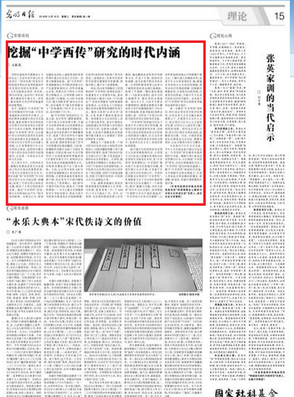 无论是对于中外文化交流、中外人文交流还是中国文化走出去,“中学西传”研究都具有强烈的时代内涵。随着中国日益走近世界舞台中央,今后推进“中学西传”研究,应该在积极吸收历史上“中学西传”成功经验的基础上,赋予“中学西传”新的时代内涵,为中国提升全球治理能力、打造人类命运共同体提供新概念、新范畴、新表述,贡献中国智慧和中国方案。