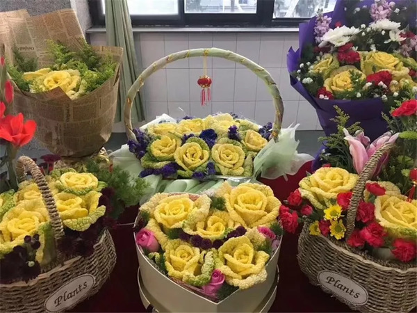 记者在南京农业大学看到,“黄玫瑰”有包装精美的花束、还有装点别致的花篮, 仔细观察才会发现,玫瑰花朵其实是菜心。