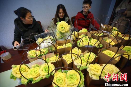 2月13日,南京农业大学园艺学院的大学生正在将“玫瑰白菜”进行包装,准备上市销售。