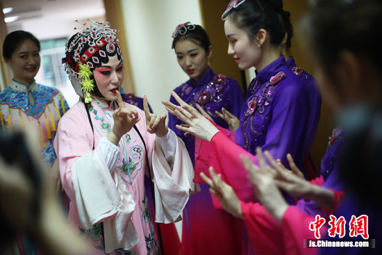 主持人徐兆佩(左)向大学生们传授戏曲动作。 泱波 摄