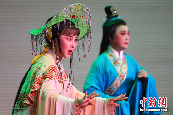 戏曲名家竺小招、陶琪(左)表演越剧《柳毅传书·湖滨惜别》。 泱波 摄