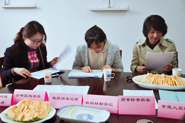 在幼儿园园长张仁萍的陪同下,17位家长代表对食堂进行参观检查。家长们现场检查了食堂初加工间、烹饪间、餐具清洗消毒间、饭菜存放间、库房等区域管理,参观了工作人员对食品原材料的加工、分发饭菜等环节的操作流程,对食堂采购验货、供货方资质、库房出入登记、食品留样、安全记录以及日常消毒记录等23本台账进行了查阅。保健医生重点介绍了幼儿一餐两点食谱制定、日食谱及用量操作、以及出入库管理。家长们现场品尝了幼儿当日午餐与点心。