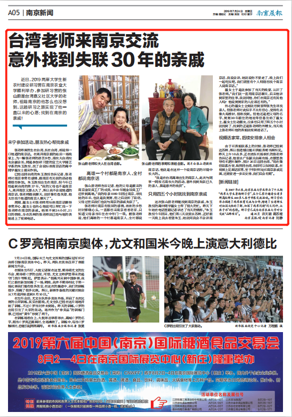 近日,2019两岸大学生新农村建设研习营在南京农业大学顺利举办,参加研习营的张山蔚是台湾嘉义社区大学的老师,祖籍南京的他怎么也没想到,这趟研习之旅实现了他一直以来的心愿:找到在南京的亲戚!