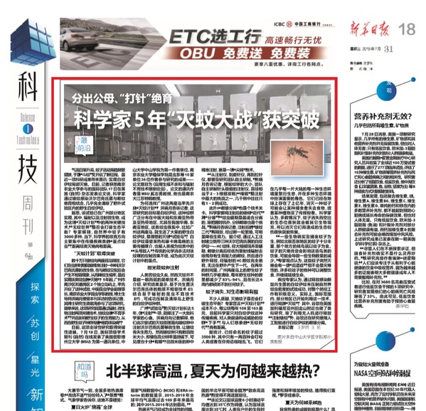 日前,这项全球性研究取得突破性进展。7月18日,国际顶级学术期刊《自然》在线发表了美国密歇根州立大学(MSU)为第一通讯单位、中山大学中山学院为第一作者单位、南京农业大学植保学院昆虫系等10家单位36位作者参与研究的成果——论文题目为《应用生殖不亲和与辐射不育技术根除蚊虫》。论文的通讯作者是MSU奚志勇教授,他也是南农大江苏特聘教授。
