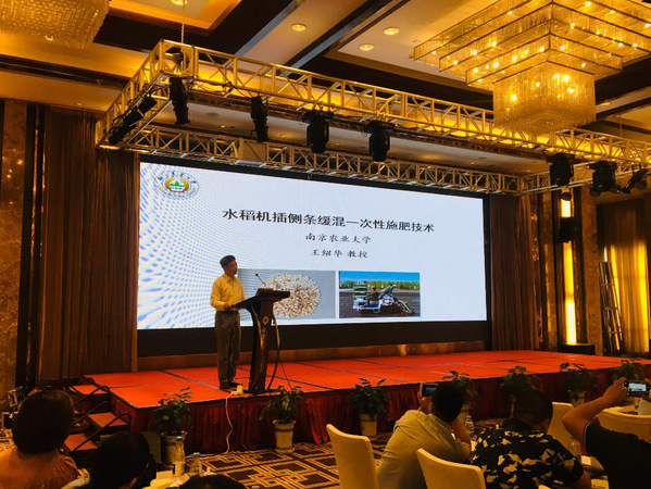 用户代表江苏金色农业有限公司王宣山总经理报告题目为《“缓控释肥机插同步侧深施”综合技术的应用》,他指出,缓控释肥机插同步侧深施综合技术能够大幅降低肥料的使用量,最终达到水稻生产节本、省工、增产、增效、减少污染的目的。