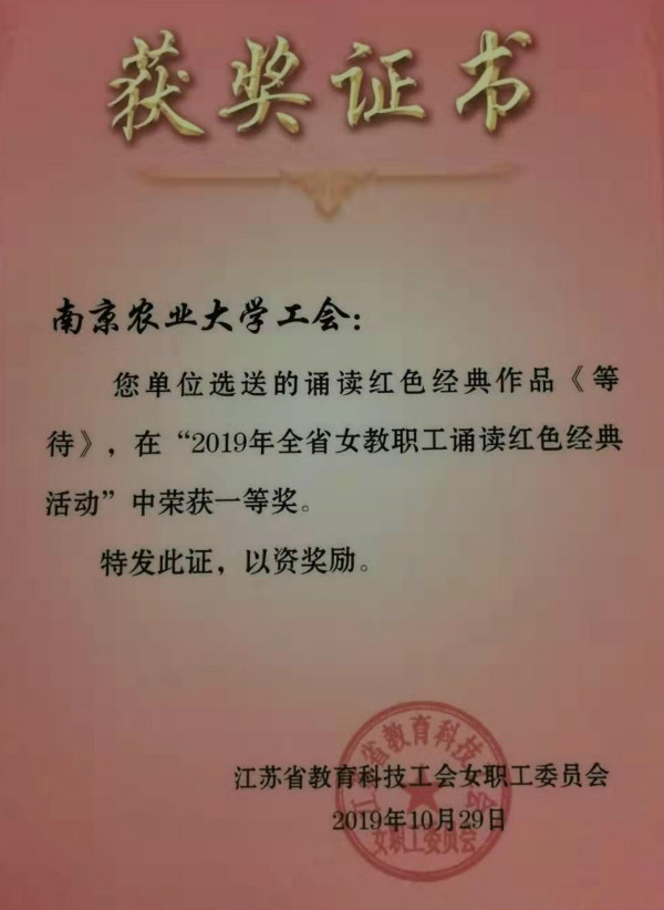 10月31日,由江苏省教育科技工会主办的诵读红色经典汇报展演在南京天丰大酒店举行,我校选送童菲老师诵读的作品《等待》以出色的表现脱颖而出,赢得一致好评,并荣获一等奖。