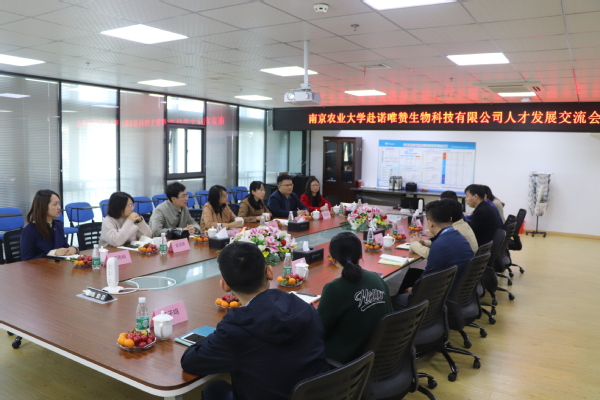 11月14日上午,南京农业大学学生工作处副处长吴彦宁、生命科学学院党委副书记李阿特、食品科技学院党委副书记邵士昌、校就业指导中心代表及食品院、动科院、动医院、生科院就业工作辅导员代表一行8人赴南京诺唯赞生物科技有限公司走访交流。南京诺唯赞生物科技有限公司董事长曹林、生命科学事业部副总经理聂俊伟、基础科学事业部副总经理冯速、人力资源部总监张国洋等公司领导热情接待了我校代表。