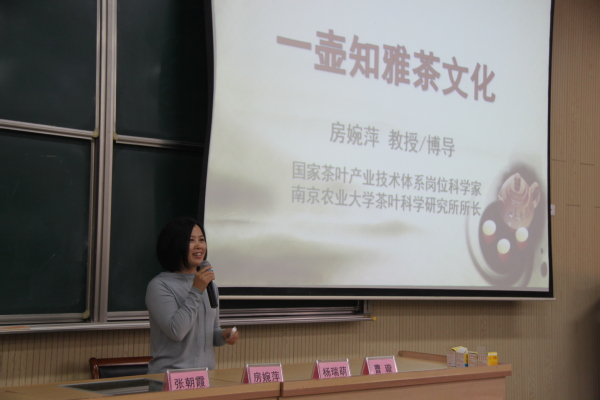 讲座正式开始前,房婉萍首先为同学们播放了南京农业大学招生宣传片,同时对我校发展历史、学科建设、科学研究等方面内容作介绍。接着,房婉萍作《一壶知雅茶文化》讲座,主要介绍了茶叶的起源、分布、类别、保健功效,以及茶学和茶文化学的相关知识。