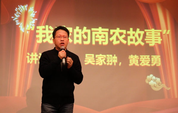 两位校友讲述“我家的南农故事”。01级计算机应用与技术专业校友吴家翀、04级机械设计专业校友黄爱勇分别讲述了各自家族与南农的故事。吴家翀及其叔叔、侄子三代人均就读于南农,黄爱勇及其妻子、姐姐、姐夫、妹妹、妹夫、弟弟、外甥八人均就读于南农。他们不仅在南农收获了学业,也收获了爱情。
