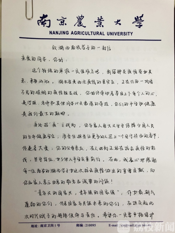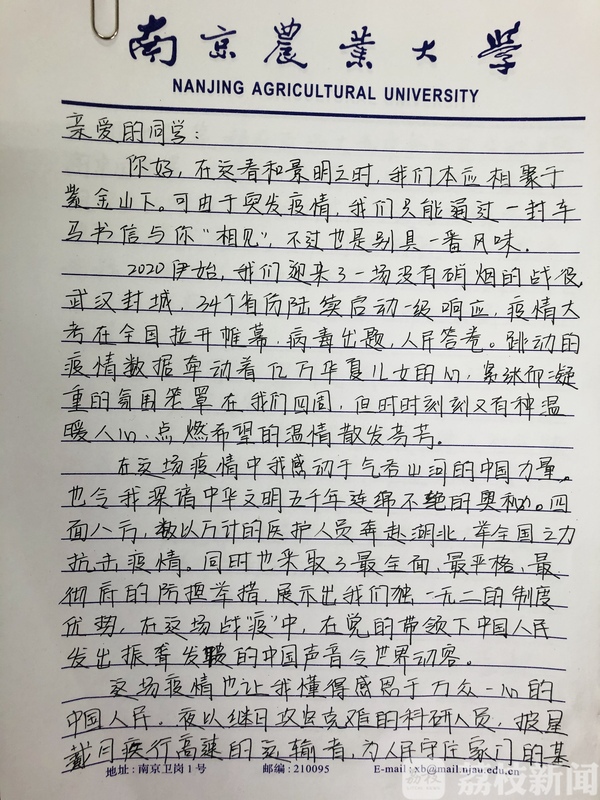 南京农业大学学生工作处处长刘亮告诉记者,在学校前期开展的疫情防控期间学生思想、心理状况动态调研中,有近20%滞留湖北的同学表示身处疫情中心,心里难免焦虑和害怕。在每日不间断的信息化沟通手段外,学工处号召辅导员老师,能否通过手写书信的方式,用文字传递别样温度,倾听学生所想、了解学生所需,送去慰藉与温暖。