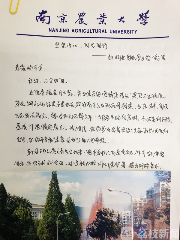 近日,南京农业大学滞留湖北的213位卫岗校区本科生,每人都收到了一封由学校辅导员老师寄来的手写书信,这213封信件捎去了跨越千里的问候,在这个乍暖还寒的初春,给滞留湖北的南农学子带来融融暖意。