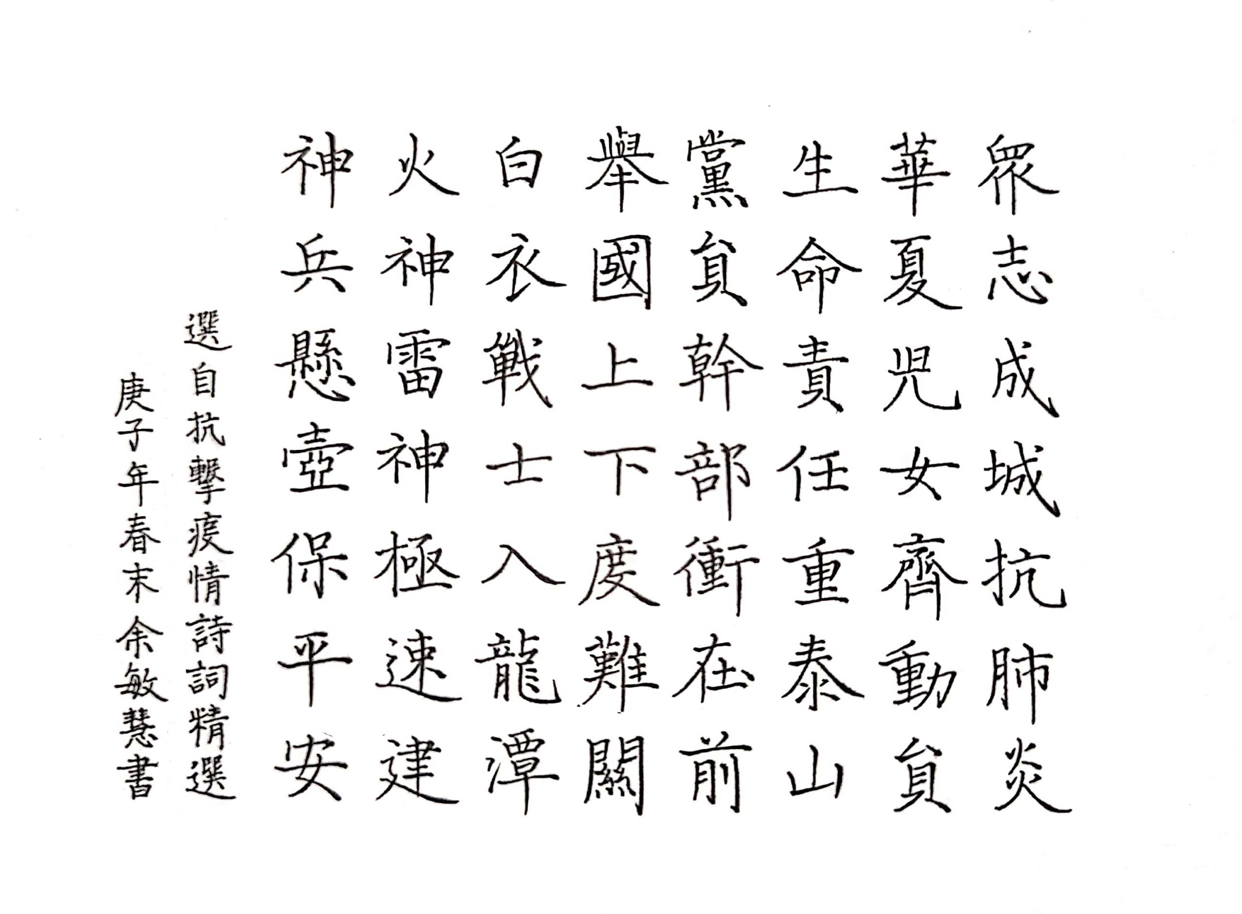 活动由校书法协会“秾墨钟彩”组织,通过微信公众平台等线上平台及书法协会兴趣群等方式进行宣传,面向学校全体学生,采取线上报名并提交作品的方式进行。活动开展以来,得到广大学生的积极响应,截止5月5日,收到软笔和硬笔书法作品共计121件。共克时艰,共书新章,参赛作品或表达抗疫心声,或歌颂战役勇士,或抒发感激之情……其中不乏笔势流畅、笔画清劲、圆熟洒脱、气势奔放之作。