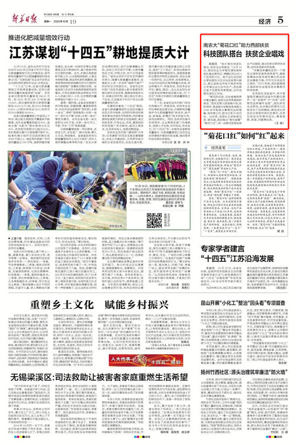 “菊花的花型、花色是植物界中最丰富的,被称为自然界育种的奇迹。”团队负责人陈发棣介绍,他的导师、原金陵大学教授李鸿渐从1944年开始就从事菊花品种搜集、保存等工作,距今已有76年历史。近年来,该团队从研制菊花茶、菊花酒,再到推出“菊花面膜”“菊花口红”,用一朵菊花培育延伸出产业链条,通过创新共享研究成果,拉动东西部共同发展。