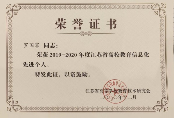 12月1日、2日,江苏省高校第二届信息技术与教学促进大会(ITET2020)暨江苏省高等学校教育技术研究会2020年学术年会召开,我校获得江苏省高校2019-2020年度教育信息化先进集体,信息化建设中心综合规划部主任罗国富同志荣获江苏省高校2019-2020年度教育信息化先进个人。