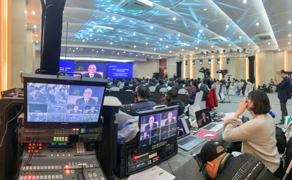 直播现场搭建了5台广播级摄像机和3台笔记本信号源,通过音视频转换及切换,分别与现场同声传译系统声音加嵌,进行现场录制和推流至学校云端直播平台、新华社客户端和ZOOM会议系统。为确保全球参与者能流畅地观看直播和参与互动,本次直播平台架设在阿里云端,在活动现场开通专用网络线路,并申请了国际流量加速,确保万无一失。本次活动直播和互动共有1000余人次在线参与,新华社客户端浏览量达100余万,多路直播信号流畅、稳定。