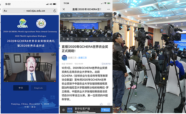 12月1日,2020GCHERA世界农业奖颁奖典礼采取线上线下方式同步进行,为实现颁奖典礼更好的收看效果和线上互动,信息化建设中心按照学校要求成立工作组,提前制定颁奖典礼双语直播与云端互动方案,实现了PC端、移动端中英文双路高清直播和ZOOM线上实时互动交流。