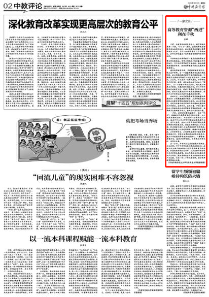 建设高等教育强国,实现国家教育现代化,难点在中西部。当一个国家高等教育发展到高级阶段,就必须摆脱精英教育阶段的路径依赖,引领国家发展的高等教育必须实现多样化、均衡化、大众化,而不是单一化和同质化。中西部地区不同区域、类型、特色的学校都可以成为“国家队”,在人才培养方面尤其如此。通过建立转移支付制度、优惠政策和相应机制,加大对中西部地区的教育支持,有利于高等教育资源的合理分配,有利于发展更加公平更有质量的教育,有利于为中西部地区的教育发展提供新引擎。