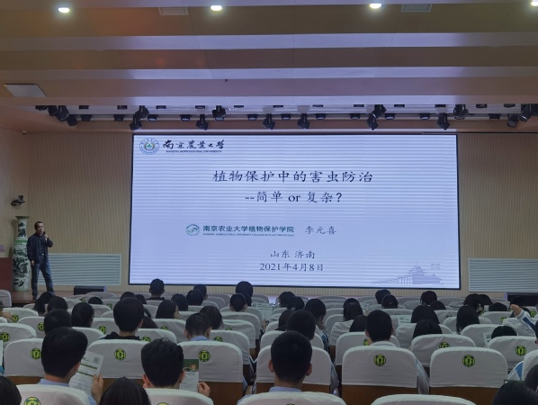 在山东省实验中学,李元喜为山东省实验中学近300名学生作了题为《植物保护中的害虫防治——简单or复杂》的科普知识讲座。他从身边的昆虫说起,利用3个案例,带领同学们走进神奇的昆虫世界,深入浅出、生动有趣的报告,赢得了在场学生的阵阵掌声。