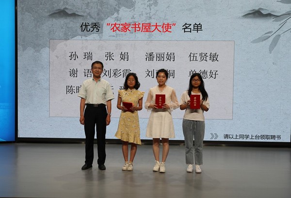倪峰总结了历届读书月活动并指出,自2018年举办读书嘉年华以来,参与协办读书月的学院从原来的1-2个发展到本届的9个学院8支训练营,读书月的参与人数和参与广度等方面都取得了新的突破,其中阅读训练营的共读活动参与人数达上万人次,充分体现了我校优良的校风和浓厚的文化氛围。他高度评价了农家书屋大使活动,指出农家书屋大使的工作,对推动乡村振兴,提高乡村文化氛围和农民文化素质具有重要的作用。