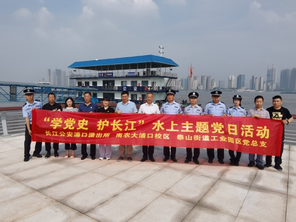 6月9日下午,浦口校区管委会党工委安全保卫工作办公室党支部、长江航运公安局南京分局浦口派出所党支部、泰山街道工业园区党总支联合开展“校警联盟、共学党史、共护长江”水上主题党日活动。