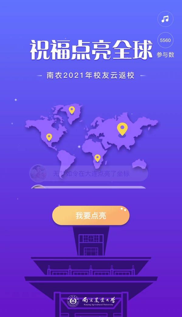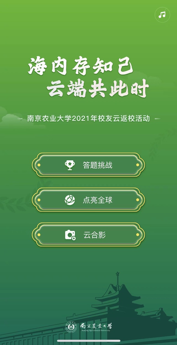 在2021年校友返校日期间,校友总会办公室还制作了返校日H5云返校活动链接,校友们通过链接可以参与校史知识挑战赛、南农校友点亮全球、云合影等在线活动。校史知识挑战赛环节准备了100道与南农有关的题目,吸引了近5000位校友们在线抢答。在点亮全球环节,世界各地的5400位校友从25个国家、379个城市为南农发来祝福。在云合影环节,卫岗校区、浦口校区以及包括继续教育学院在内的20个学院都提供了精美的背景照片供校友们在线生成云合影,本次共有近4500位校友参加云合影。