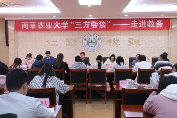 11月25日,校团委、校学生会联合开展的“三方会谈”——走进教务活动在金陵研究院二楼会议室举行。教务处处长张炜、校团委书记谭智贇、校长办公室副主任鲁韦韦、相关部门工作人员、校学生会工作人员、校长学生事务助理及各学院学生代表50余人参加座谈。