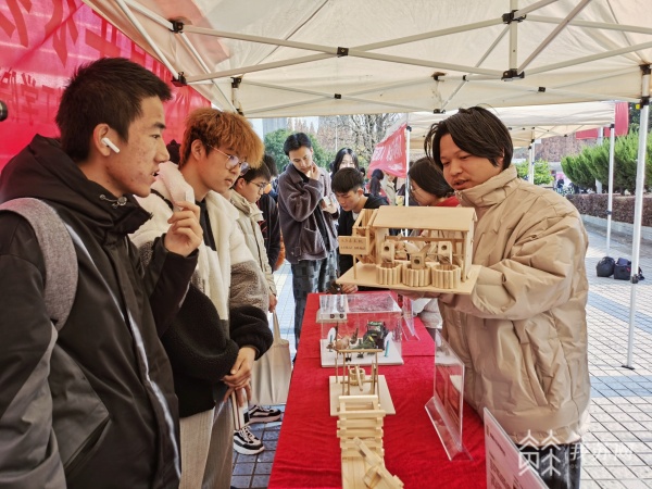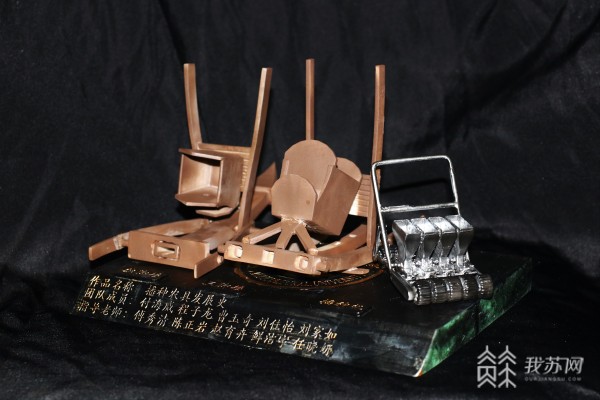 活动现场,最吸引眼球的还属几组学生制作的农耕工具手工作品,吸引了很多师生驻足观望。原来,这些作品均是由在校学生手工制作而成。作品分别围绕“耕、种、管、收、储”等农业耕种及生产的五个重要环节所涉及的农业机具,采用木头、水泥、金属、塑料等材质,利用3D打印、手工打磨、人工涂色等技术,制作体现古代经典机具至现代机具变化的农耕模具组合。