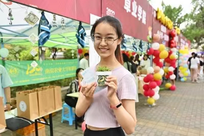 在草业学院的迎新现场,学院现场铺设了草皮供新生合影留念;2023年杭州亚运会同款草皮盆栽作为主要入学礼物,学院动员新生通过一个月的浇水、施肥、修剪等养护措施,最后比长势、看成长。