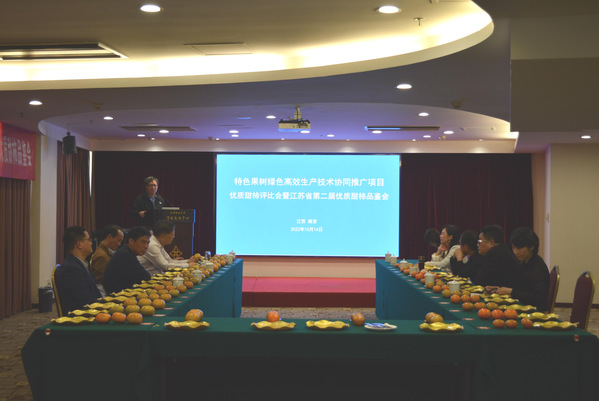 10月14日,由南京农业大学、江苏省农业技术推广总站联合举办的特色果树绿色高效生产技术协同推广项目(以下简称“项目”)优质甜柿评比会暨江苏省第二届优质甜柿品鉴会在我校召开。江苏省财政厅农业农村处二级调研员储惠平,省农业农村厅科教处处长姜雪忠,省农业技术推广总站副站长顾鲁同,南京市农业农村局科教处副处长王祥,我校社会合作处和园艺学院相关负责人以及项目组专家等出席会议。