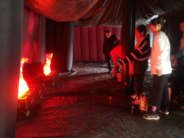 培训后,随着总指挥崔春红一声令下,现场警报声响起,楼宇内消防声光报警联动。图书馆全体工作人员及学生在安全员的引导下,分别从浓烟滚滚的图书馆大楼东门和北门有序快速疏散,所有人员经过烟雾帐篷、跨过火线,安全疏散至指定地点集合,清点人数,查看有无人员受伤。