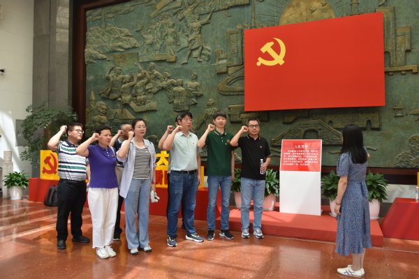 在博物馆大厅,面对党旗,全体党员举起右拳在院党总支副书记於朝梅的带领下再一次重温了入党誓词。