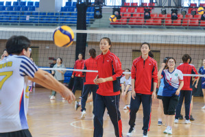在互动交流环节中,广大师生踊跃提问。教练员和运动员也就平时日常排球训练中战术安排、技术突破和比赛心态调节上结合亲身经历和经验等热情交流。活动现场,江苏女排队员还对我校高水平女排队和排球爱好者的扣球、传球和罚球等实战技术进行了指导。