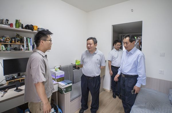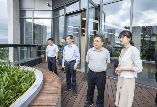 吴荣顺一行首先来到三亚崖州湾科技城创新研学谷公共教学区考察参观,崖州湾科技城管理局教育合作促进部部长周肖雅接待了吴荣顺一行。周肖雅向吴荣顺介绍了创新研学谷整体规划和入驻高校情况,并陪同吴荣顺一行参观了图书馆、体育馆、公共教学区等功能区域。在创新研学谷,吴荣顺考察了三亚研究院现代农业与绿色生产实验室,了解我校在琼团队开展科研攻关和海南专项学生学习生活情况,并来到学生宿舍看望慰问海南专项学生。