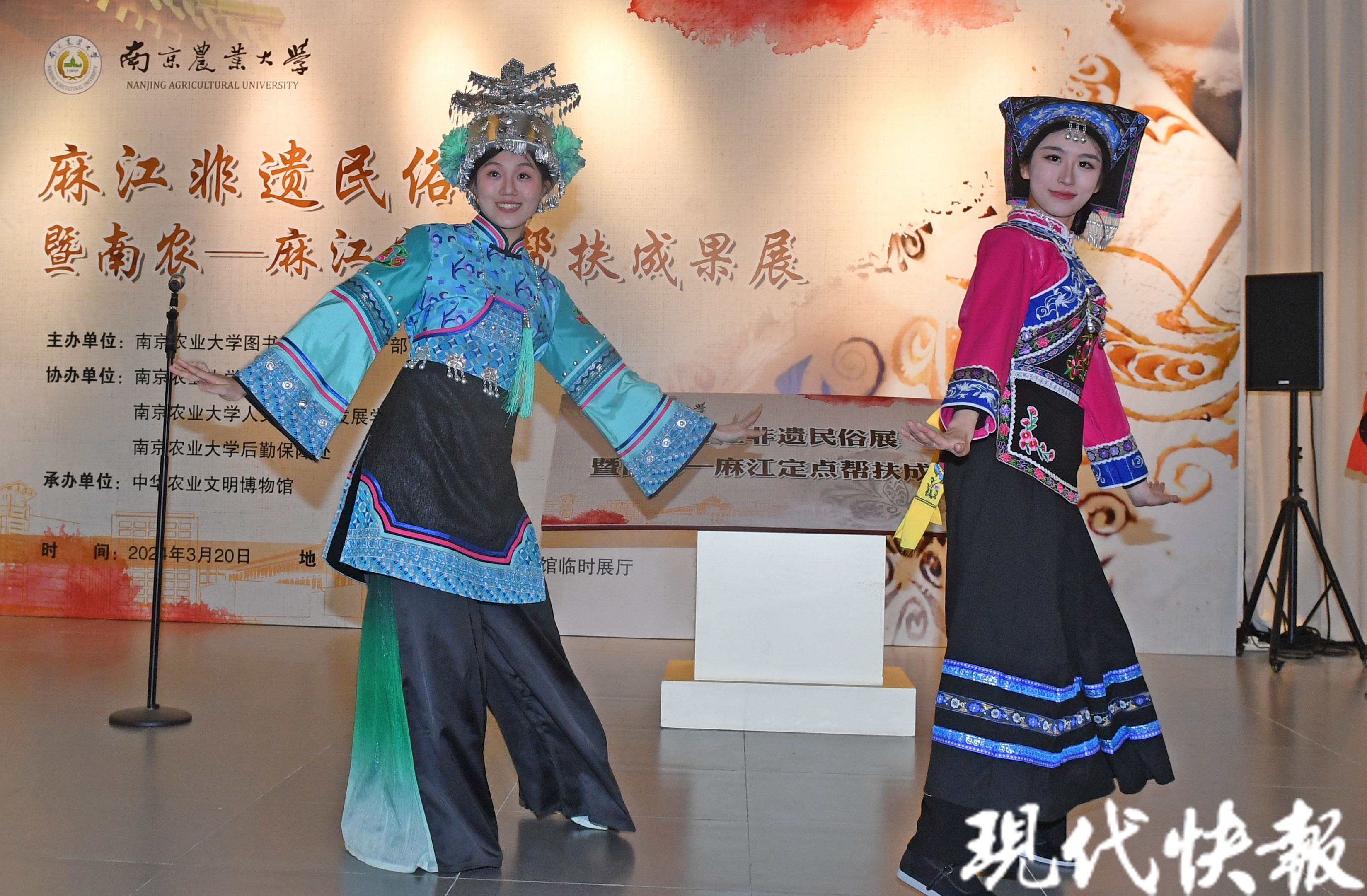 “山对山来崖对崖,蜜蜂采花深山里来……”3月20日,一首悠扬嘹亮的贵州山歌,在南京农业大学中华农业文明博物馆唱响。紧接着,一个个身穿麻江民俗特色的精美服饰的南农学子,在馆里上演了一场精彩大秀,惊艳全场。原来,当天正是麻江非遗民俗展暨南农-麻江定点帮扶成果展开展的日子,十年来南京农业大学为麻江提供了科技支撑,并打造了一支优秀的乡村产业人才队伍,不断带动当地经济发展,助力乡村振兴。