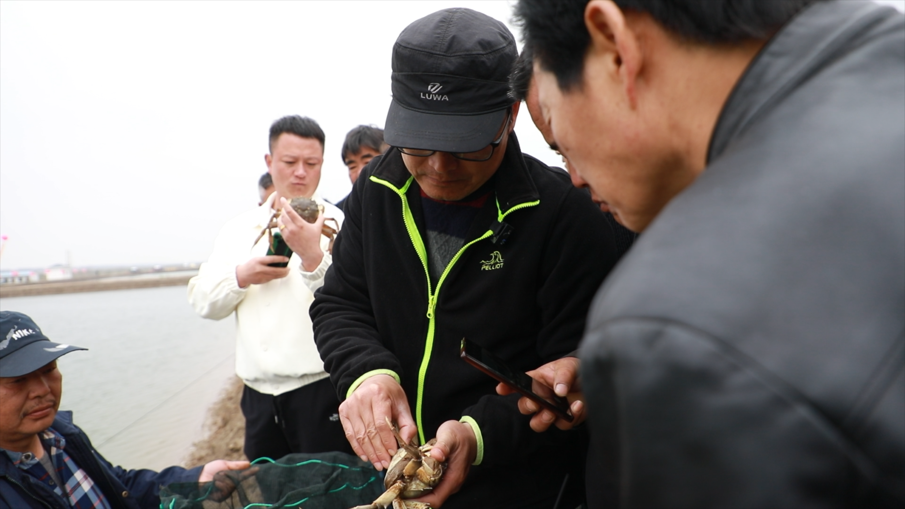 刘文斌拿着手中的母蟹向来来往往的蟹农介绍