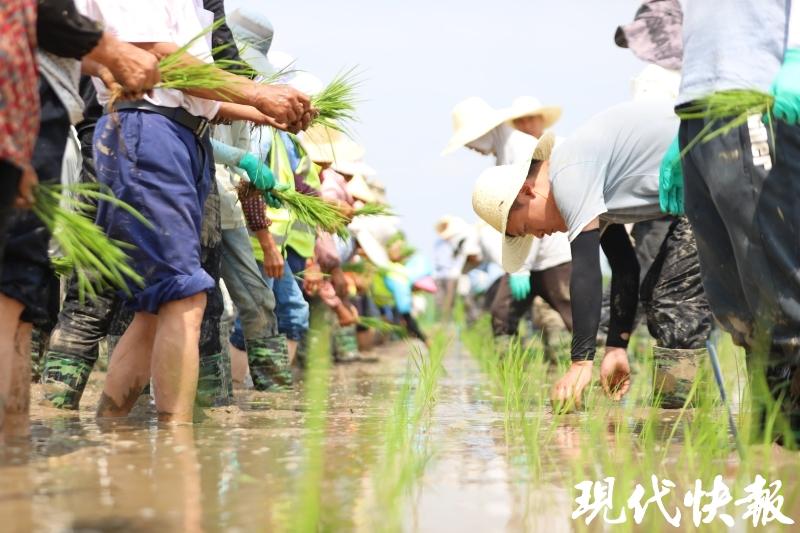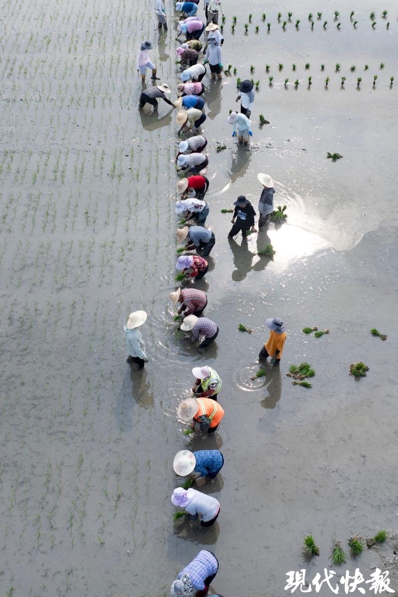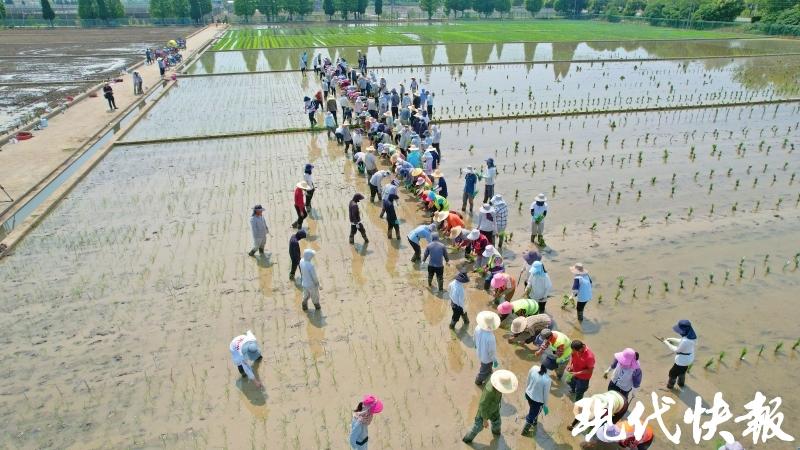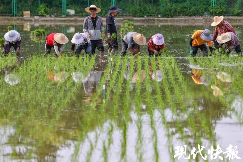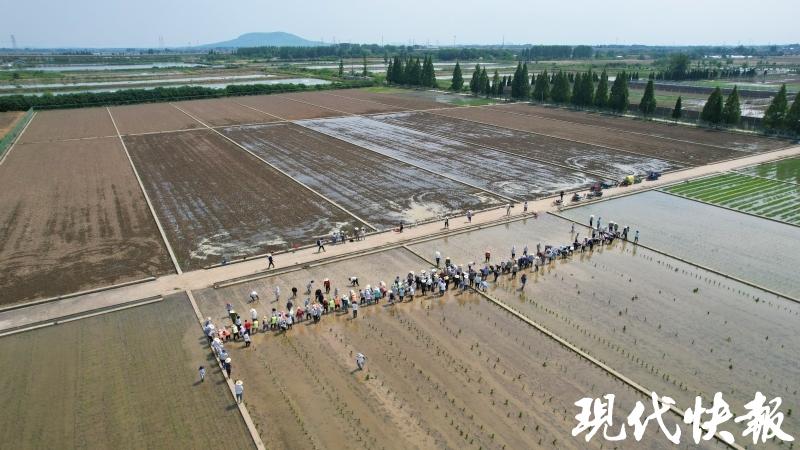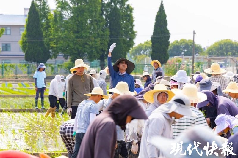 “起,拉线,换秧,插秧……”6月8日,端午假期首日,位于南京江宁的南京农业大学土桥水稻实验基地一片繁忙。正值农忙插秧季,中国工程院院士、南京农业大学水稻遗传育种与种质创新团队带头人万建民正带着150多名研究生,戴着草帽、穿着胶鞋,在水田里插秧,在试验田选育“良种”。