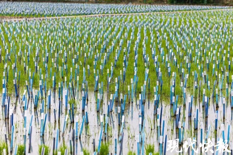 在周围插好秧的田块,每一簇秧苗背后都插着一块小牌子。“小牌子上的编号就相当于身份证号。”刘喜介绍,编号代表着水稻品系,一扫牌子上的二维码就能链接到团队的数据中心,实时显示这一品系的亲本来源、经过了几代繁育、每一代的性状如何。
