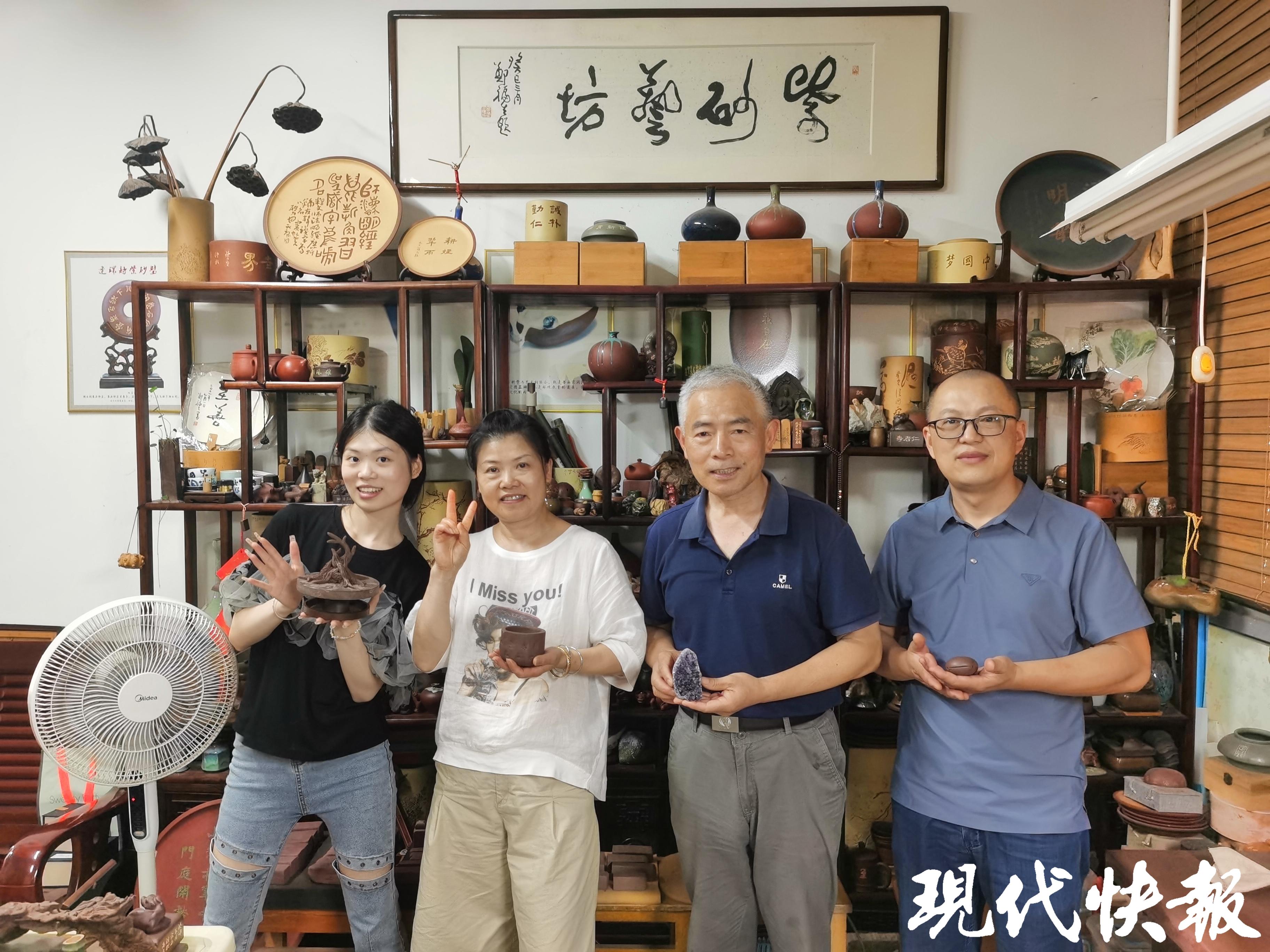 在宗良纲的指导下,刘上荣和父母分别制作了紫砂“自在鱼”、主人杯和摆件,共同体验从敲打泥片、嵌入模具、修坯到烧制的全过程。