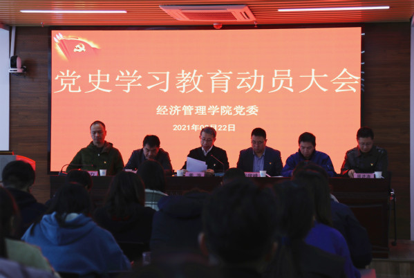 3月22日下午,经济管理学院党委组织召开党史学习教育动员大会。学院党委书记姜海主持会议,副书记宋俊峰、党委委员耿献辉、林光华、周力、展进涛出席会议。全体师生党支部书记、辅导员、2021年第一批发展对象等参加集体学习。
