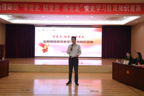 胡会奎在致辞中指出今年是中国共产党成立100周年,“中国共产党的历史是一部丰富生动的教科书”,能够让我们认清历史方位,汲取前行的智慧与力量。后勤保障部党委根据学校要求,扎实推进党史学习教育深入开展,引导全体党员职工深情回顾党的光辉历程。他要求全体参赛选手在相互交流中,赛出信念和忠诚;在相互交锋中,赛出知识和本领;在相互交融中,赛出风格和友情。全体党员要继承和发扬党的光荣传统和优良作风,做到学史明理、学史增信、学史崇德、学史力行。