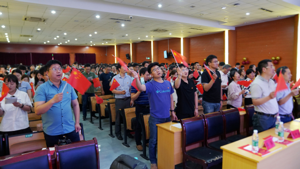 “我和我的祖国,一刻也不能分割,无论我走到哪里,都留下一首赞歌。” 伴随着熟悉的旋律响起,现场600余名师生党员挥舞着国旗,齐唱《我和我的祖国》,为中国共产党百年华诞献礼,深情表白伟大的祖国和中国共产党。