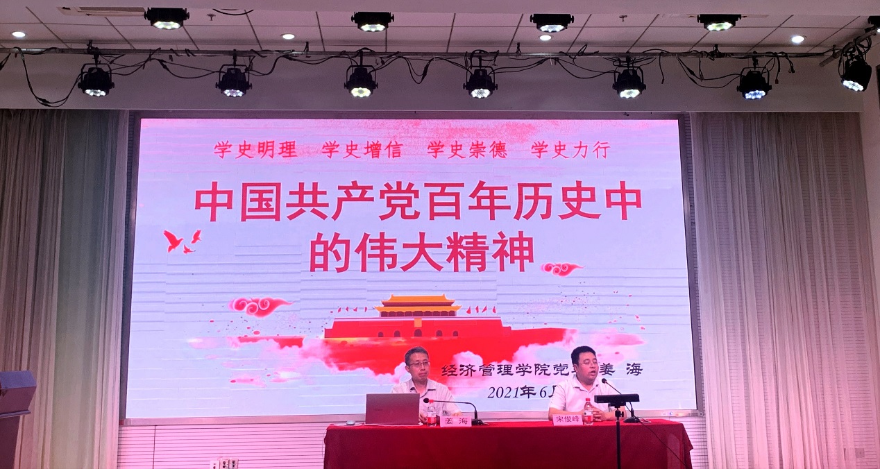 6月23日,经济管理学院党委书记姜海为学院师生上《中国共产党百年历史中的伟大精神》专题党课。学院本科生党员、研究生党员代表、入党积极分子、学生干部、班级学生代表等200余名学生参加集体学习。院党委副书记宋俊峰主持报告。报告设浦口校区分会场,2020级新生入党积极分子、入党启蒙对象通过视频直播方式参加集体学习。